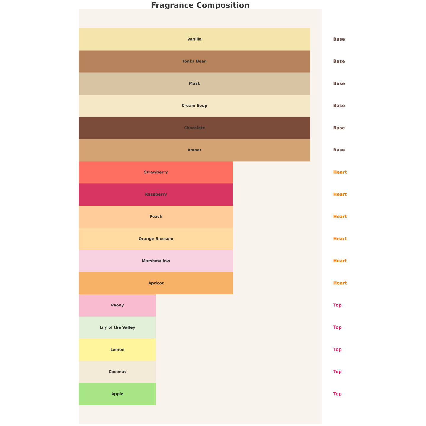 Słodko, owocowo i kremowo: marshmallow, owoce, wanilia, pralina i mascarpone tworzą miękką, przyjemną aurę gourmand.