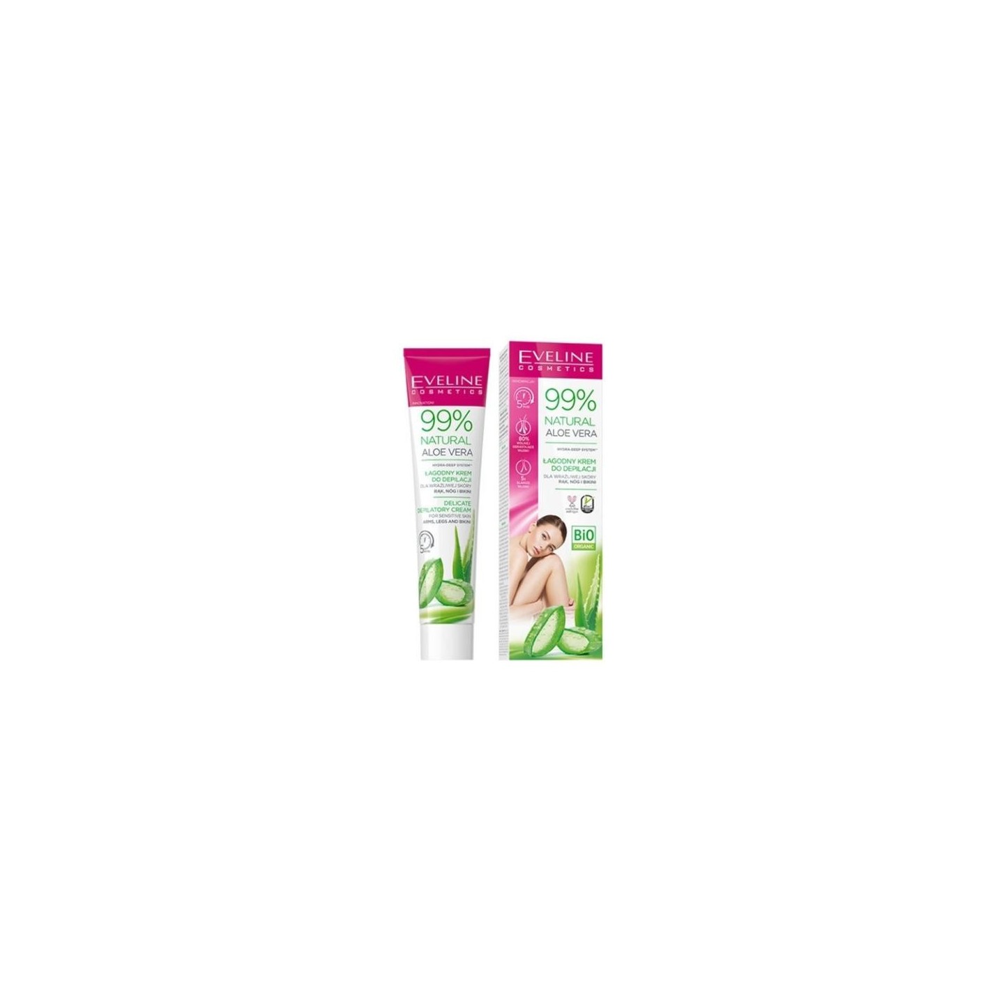Mild depilatory cream Eveline 99% Natural Aloe Vera  is tailored to specific needs sensitive skin . The cosmetic works expressly, already after 5 minutes You will be able to easily remove unwanted hair from your arms, legs and bikini area. cream by 80%  delays the process of hair regrowth , thanks to which you will be able to enjoy flawlessly smooth skin for up to 7 days !