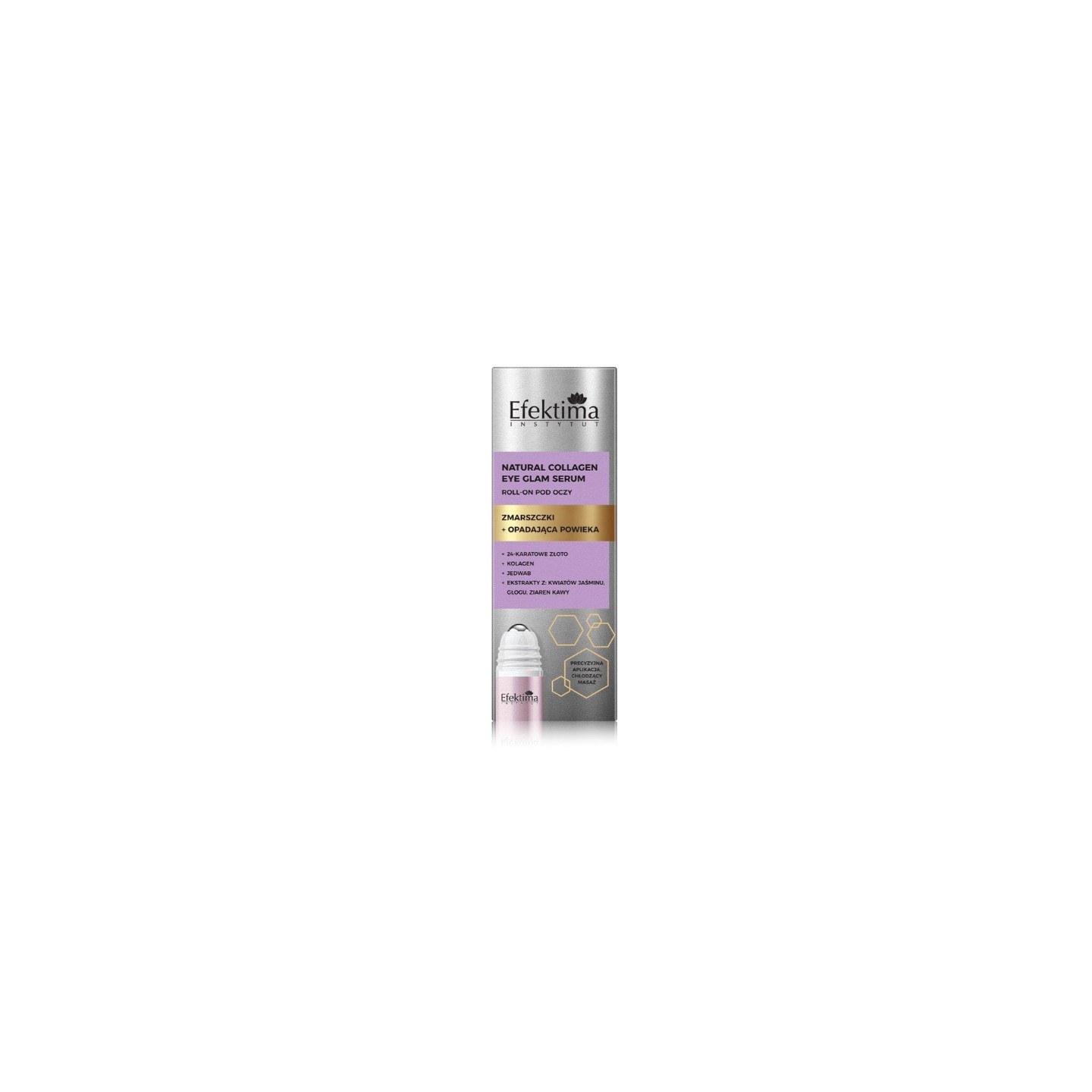 The exclusive Natural COLLAGEN – EYE GLAM serum was created for the demanding skin around the eyes—the thinnest, most susceptible to wrinkles, loss of firmness, and signs of fatigue. This lightweight roll-on emulsion ensures both treatment effectiveness and ease of use, combining massage with a cooling tip with precise application. A unique duo of white jasmine flower and hawthorn extracts works multifaceted: it firms, improves tone, smooths, and supports a lifting effect, si in a visibly lifted upper eyelid. The serum reduces the appearance of dark circles and bags, giving the eyes a fresh and younger appearance. Marine plankton extract visibly improves skin firmness and reduces fine lines, providing an immediate smoothing effect. Specially selected oils—avocado, argan, and hemp—support skin elasticity, nourishment, and regeneration, ensuring comfort and softness. The serum's collagen and hydrolyzed elastin base restores the firmness and smoothness of the delicate eyelid skin. It's complemented by plant extracts from coffee beans, peony flowers, and red tea leaves, which brighten, soothe, and energize the skin. Subtle 24-karat gold accentuates the anti-wrinkle effect.