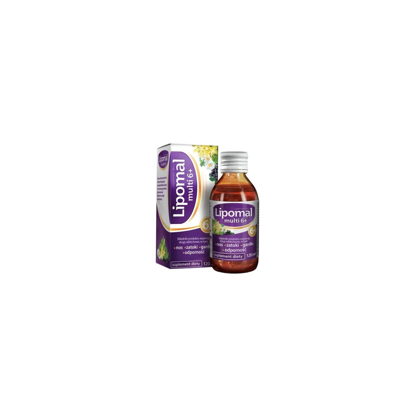 Aflofarm Lipomal Multi 6+ is a liquid dietary supplement designed for children over 6 years of age and adults. It contains a blend of natural plant extracts (linden, elderberry, chamomile, thyme, and marshmallow), as well as zinc – ingredients that support the proper functioning of the respiratory system, throat, sinuses, bronchi, and immune system.
