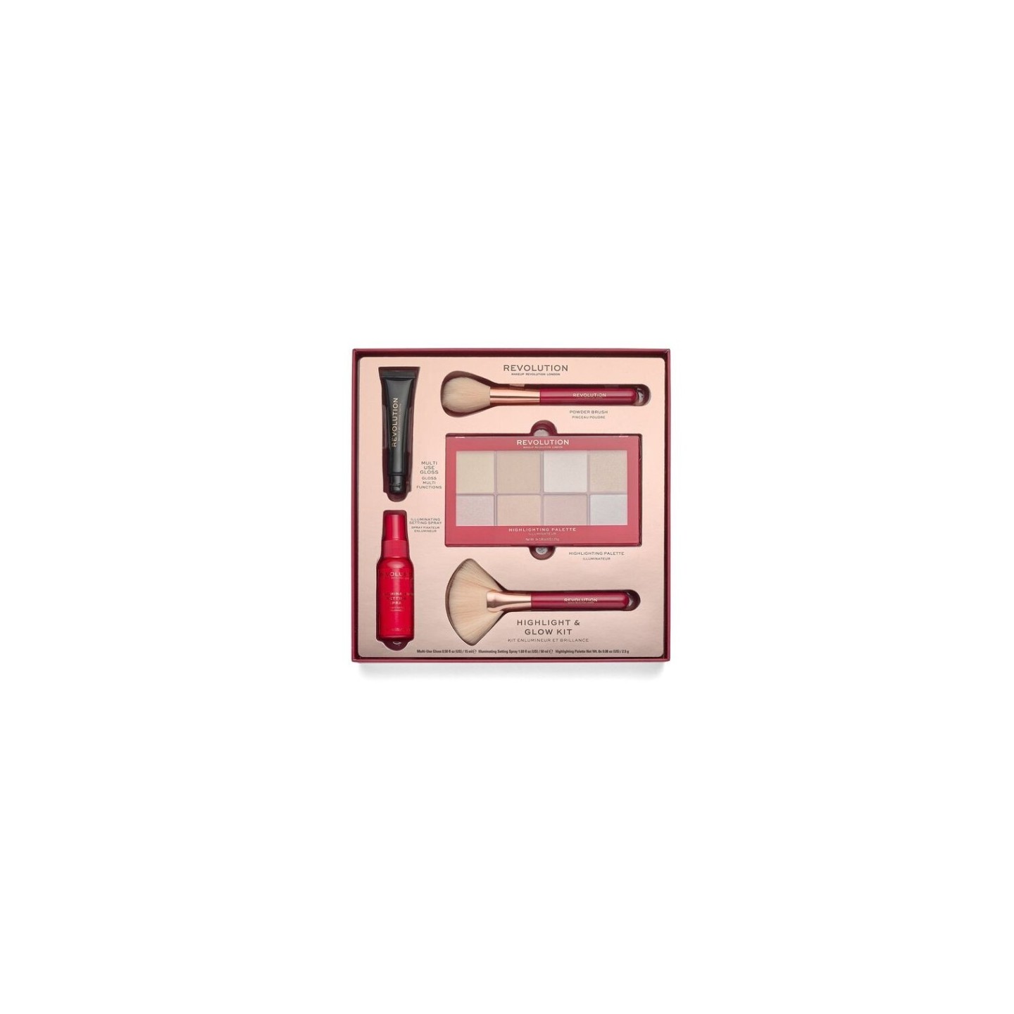 • Revolution Highlight Glow Kit: Palette of 8 highlighters, setting spray, lip gloss and 2 makeup brushes