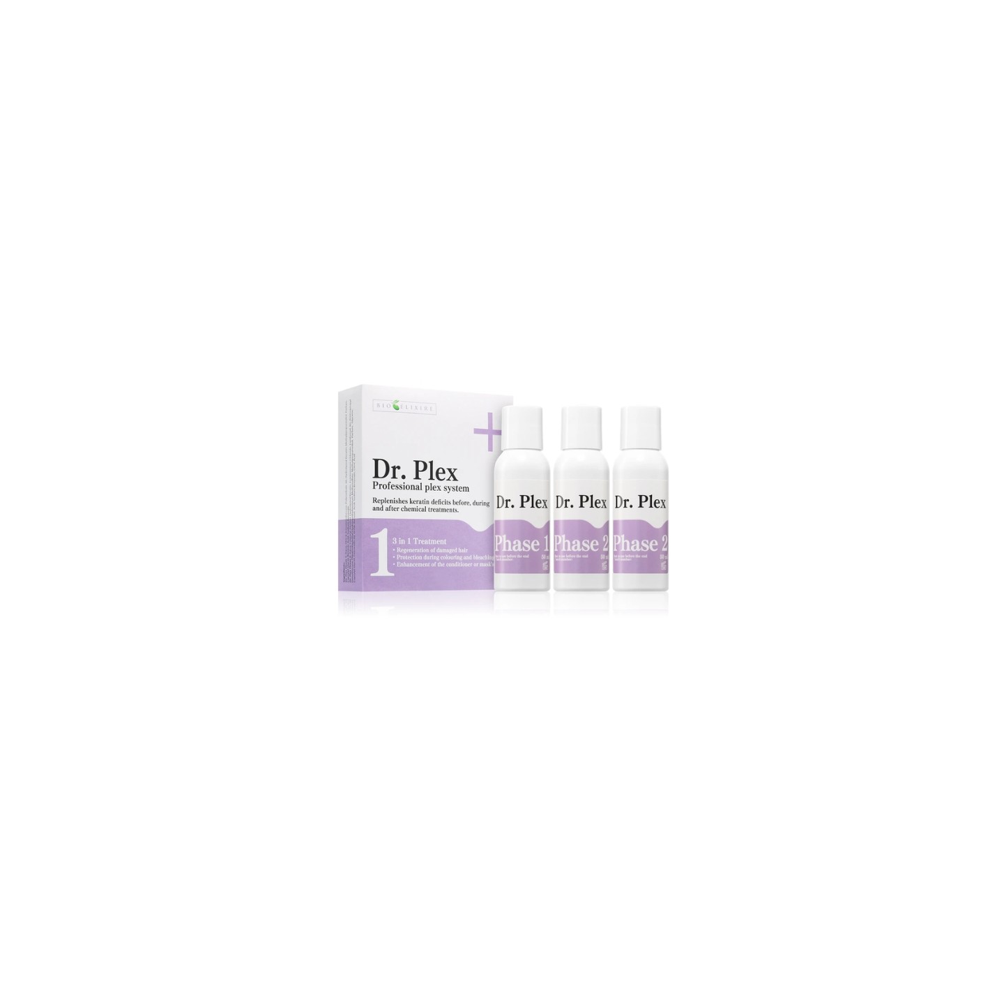 Dr. Plex is a comprehensive, salon-inspired restorative treatment, packaged in a convenient travel size or as a gift set. This two-phase system works on the hair's structure, strengthening it from within and protecting it from further mechanical and chemical damage. The formula was developed for color-treated, blond , and bleached hair requiring intensive regeneration. Keratin rebuilds damaged fibers, panthenol (provitamin B5) provides deep hydration and elasticity, and plant proteins strengthen strands, improving their resistance to breakage. This set is si for all scalp types and is a perfect complement to a daily care routine.