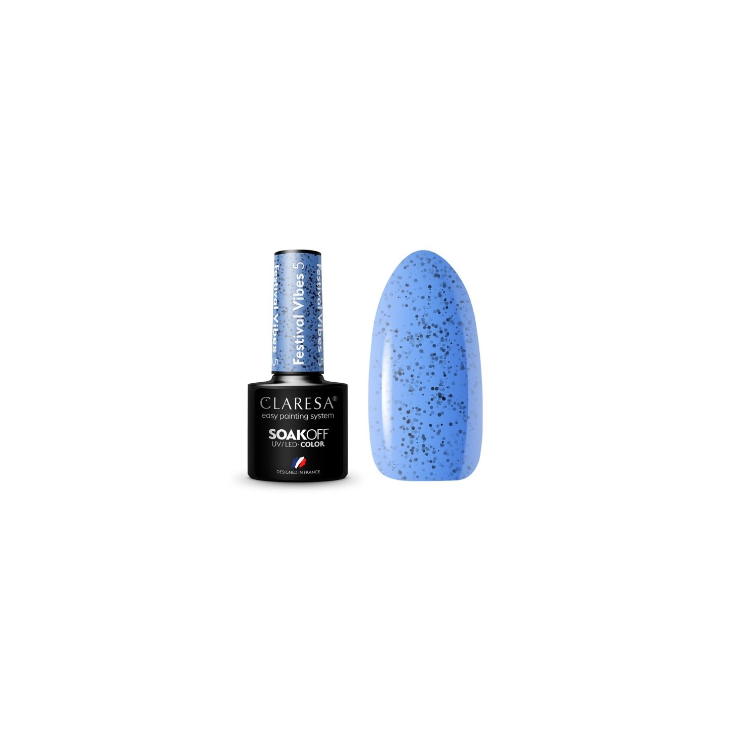 The blue shade of Festival Vibes 5 is full of eye-catching black particles and feel like a real trend queen! It ensures trouble-free application without spilling the cuticles, making nail painting easy and precise. Its formula guarantees intense shine and ideal, medium density, which allows you to achieve an even and professional effect. Additionally, the varnish lasts up to 3 weeks, leaving your nails beautiful and well-groomed for a long time.