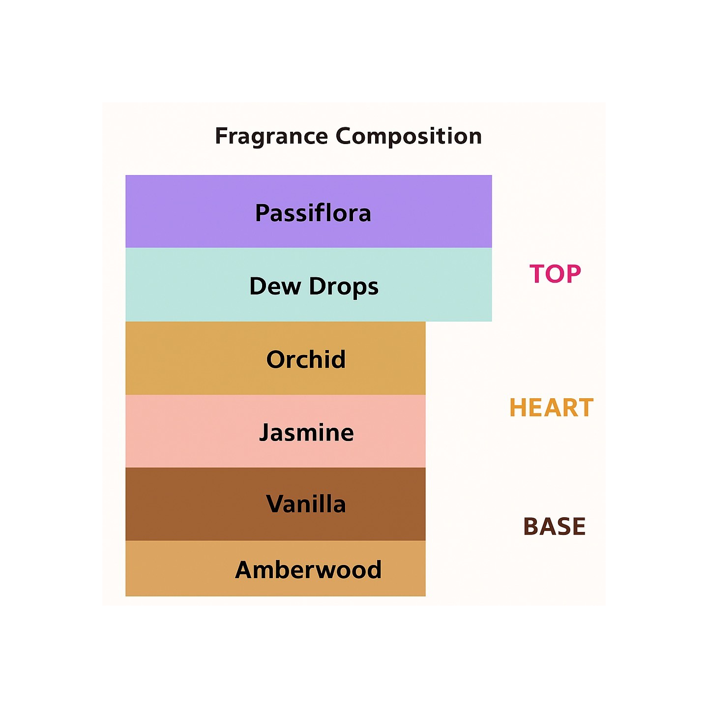 Spray the fragrance from a distance of 10–20 cm onto clean, dry skin. Apply to pulse points (wrists, neck, décolleté, the bends of elbows and knees). Do not rub – allow the fragrance to develop naturally, layer by layer.