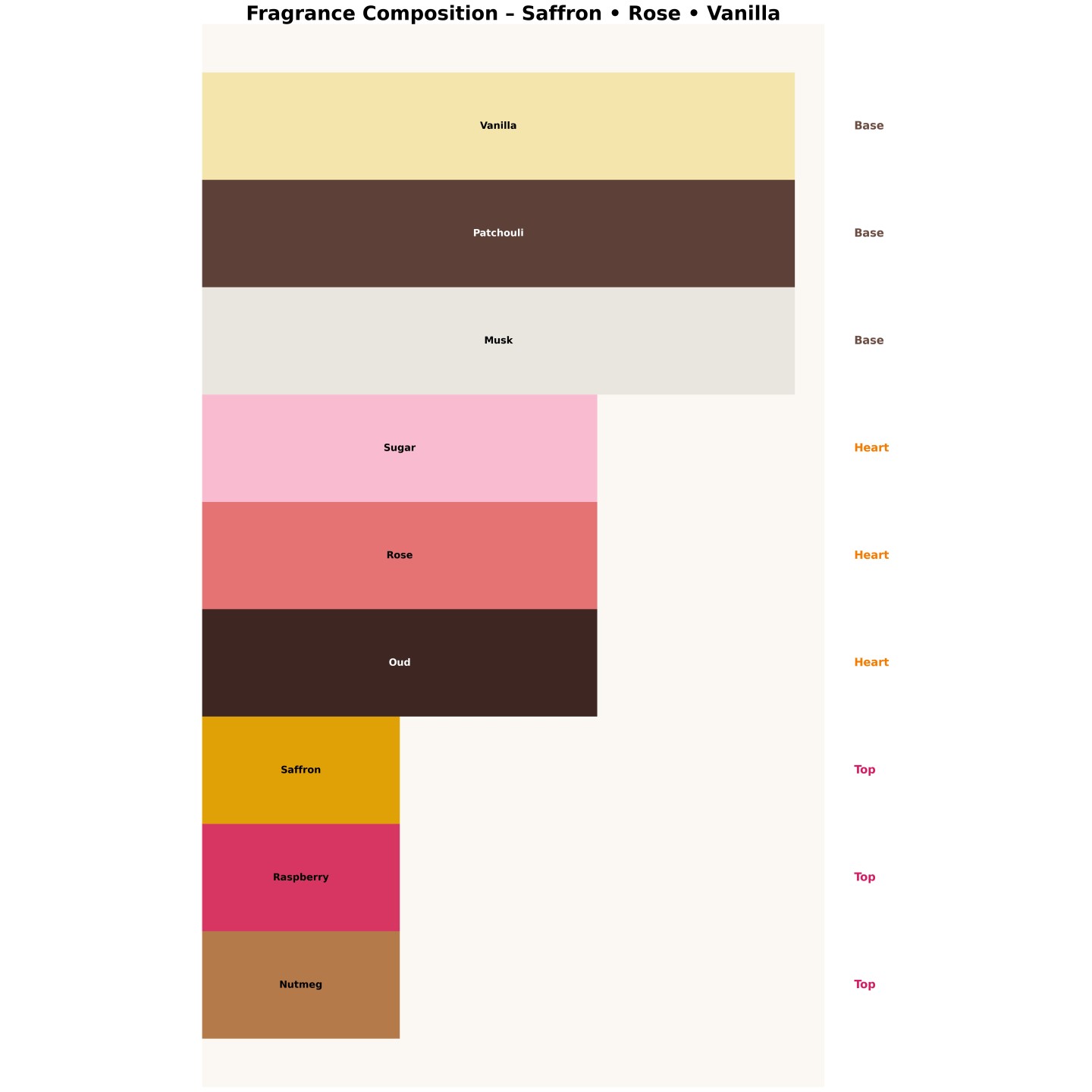 Warm, oriental and sweet - saffron and raspberry in the opening, rose and oud in the heart, vanilla and musk in the base.