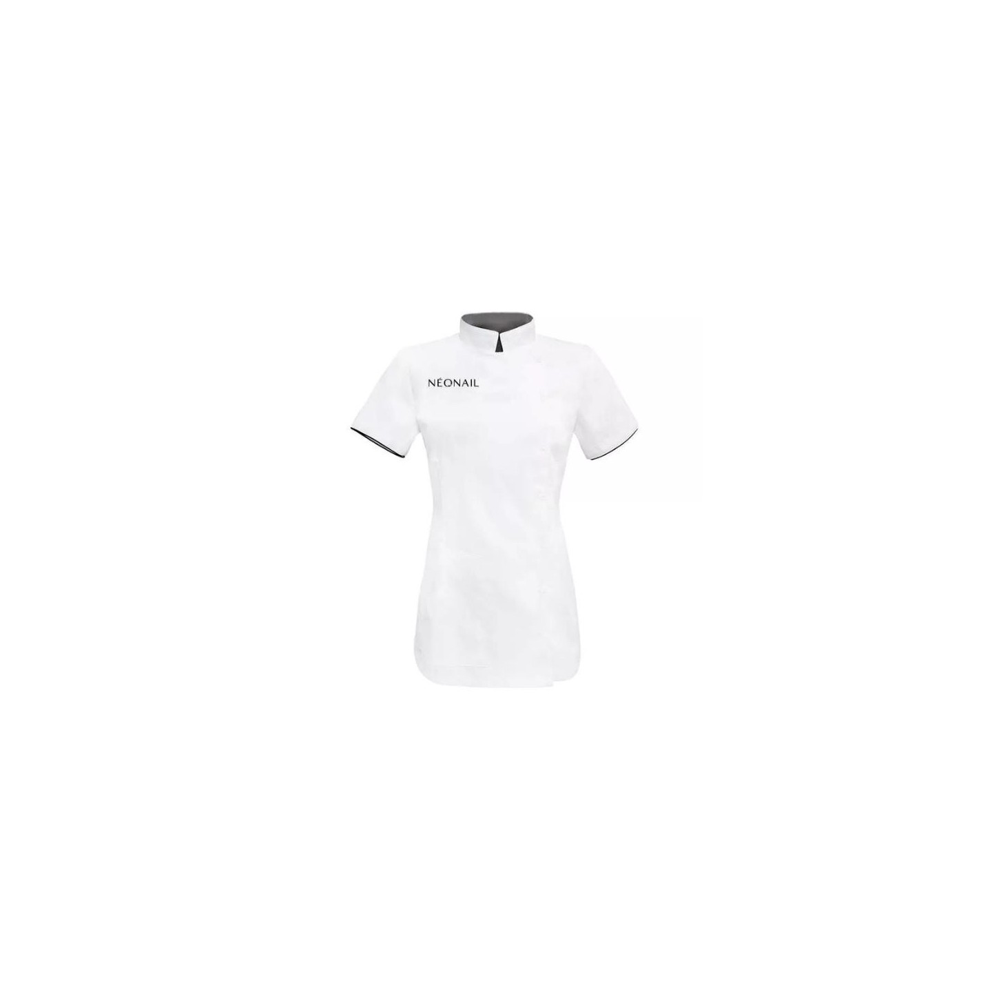 Cosmetic apron, asymmetric, fastened with press studs, finished with a stand-up collar. Short sleeve. One pocket. Fastened with snaps