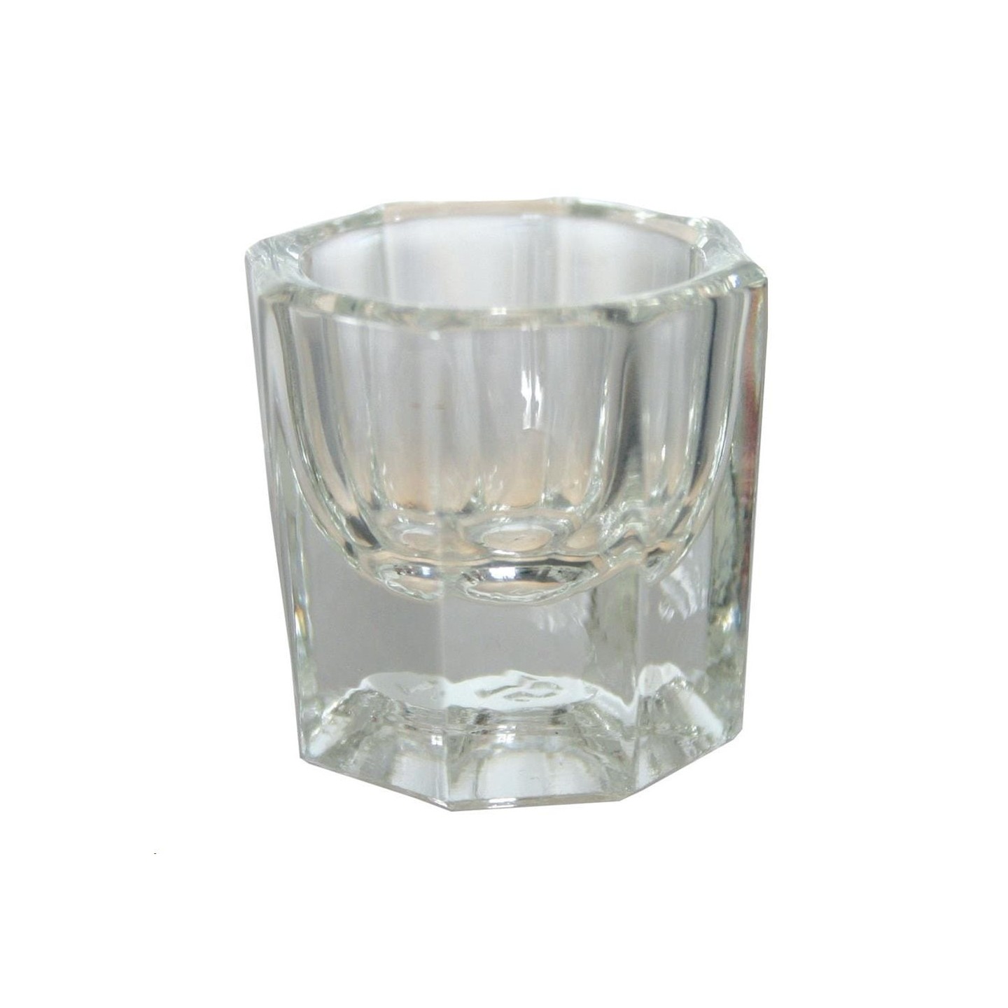 A glass vessel for dispensing cosmetic liquids. Perfect for mixing gel, acrylic or polish. Perfect as a henna dish.