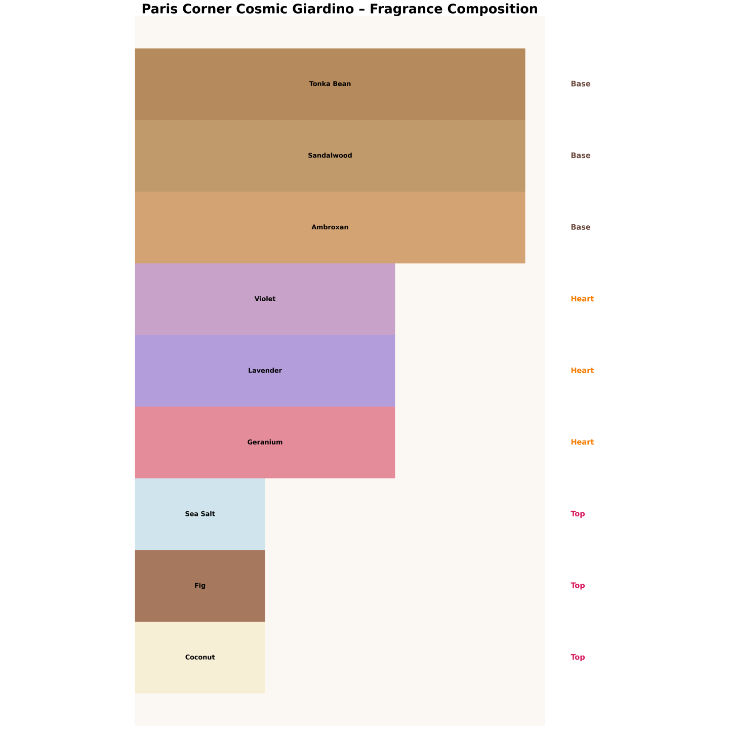 Cosmic Giardino is a fragrance reminiscent of a futuristic garden bathed in starlight – simultaneously relaxing, sensual, and intriguing. It's a modern interpretation of a woody-aromatic composition, where freshness si creamy sweetness, and herbal elegance harmonizes with mineral purity. The opening captivates with its extraordinary combination: velvety, juicy fig with a natural, milky depth, creamy kokos , and sea salt, which add a mineral freshness and a slightly ozonic coolness to the overall composition. Lavender, violet, and geranium emerge at the heart – a trio that lends the composition herbal elegance, powdery softness, and subtle green freshness. The base is modern, creamy, and sensual: tonka bean with an almond nuance, soft, milky sandalwood, and luminous, mineral ambroxan, which ensures longevity and a clean, futuristic finish. Cosmic Giardino is a fragrance for the modern man – elegant, sensitive to detail, fond of freshness, ale also subtle sweetness and woody-mineral depth.