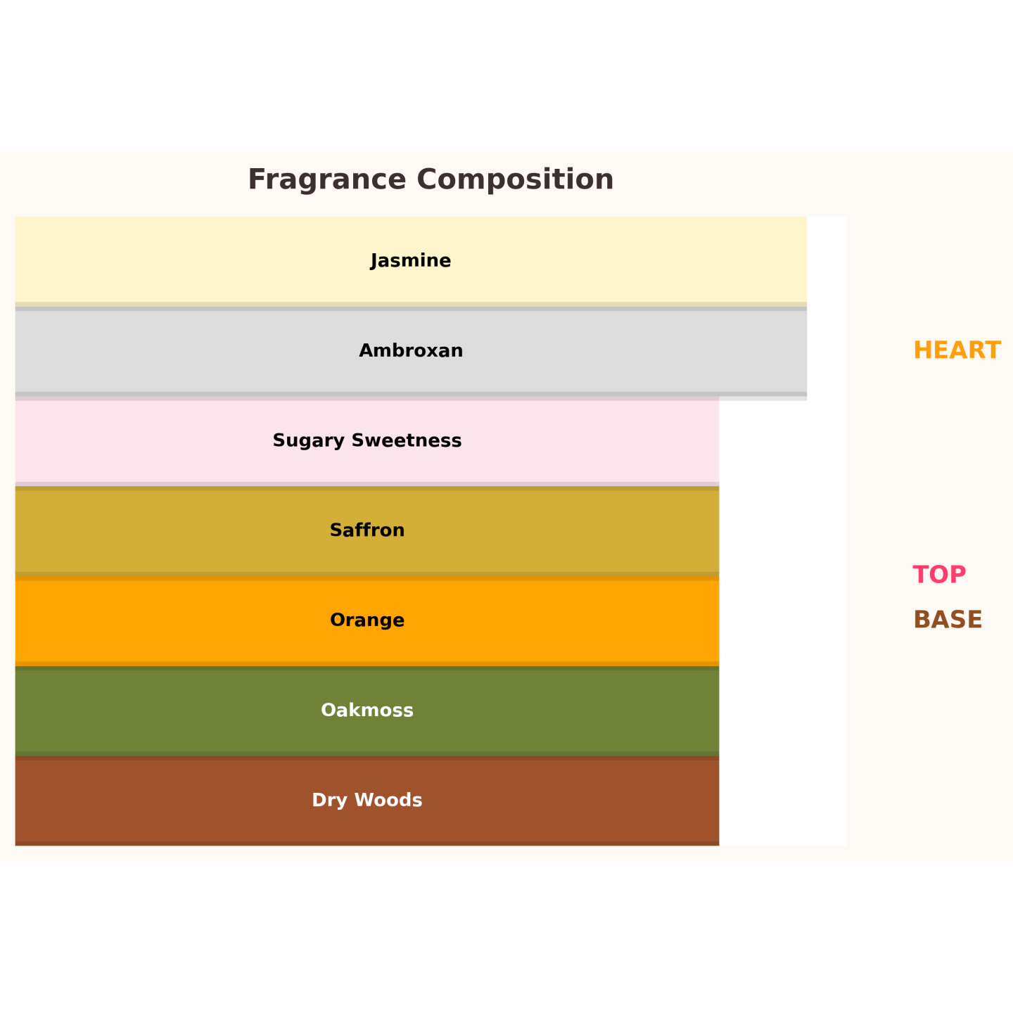 Unisex Eau de Parfum – an oriental-woody composition with a luxurious character. The opening blends saffron with juicy orange; the heart of jasmine with the velvety sweetness of sugar; a base of ambroxan, oakmoss, and dry woody notes provide depth and longevity.