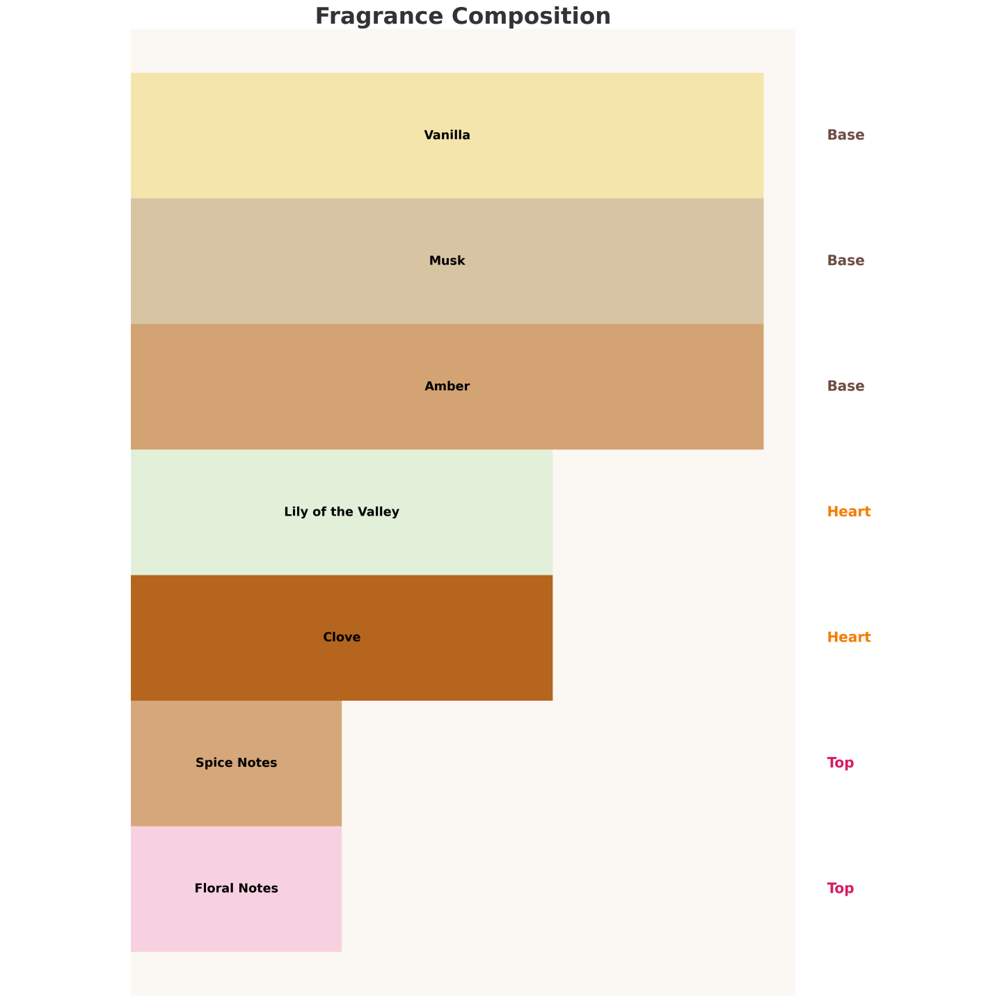 It is a slightly spicy, floral fragrance with a poetic character, with carnation and lily of the valley at the heart and a warm, sensual base of vanilla, amber and musk.
