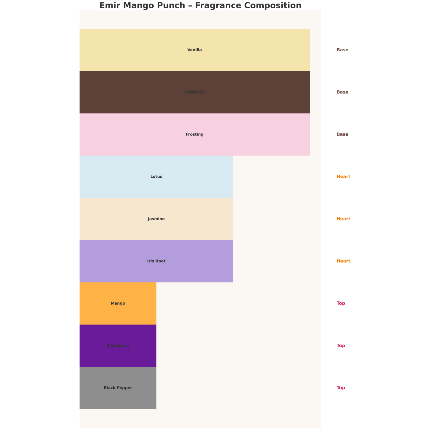 Emir Mango Punch is a fragrance that pulsates with energy and freshness—like the first sip of a tropical cocktail sipped in full sunlight. It's a vibrant, juicy, joyful, and yet elegant aroma, combining the natural sweetness of fruit with floral finesse and a subtle oriental depth. The composition was created for those who love vibrant aromas and want to emphasize their positive energy every day. It si with an explosion of mango, sweet-and-sour blackberries, and spicy black pepper, creating a sparkling, exotic beginning that immediately captures attention. Delicate jasmine, creamy orris root, and fresh, aquatic lotus blossom at the heart, lending the composition lightness, elegance, and floral harmony. The base offers an enveloping blend of vanilla, gourmand glaze, and earthy patchouli, ensuring the scent remains soft, velvety, and incredibly pleasant on the skin for hours. This unisex fragrance was created for energetic individuals who appreciate fruity, modern, and unique scents.