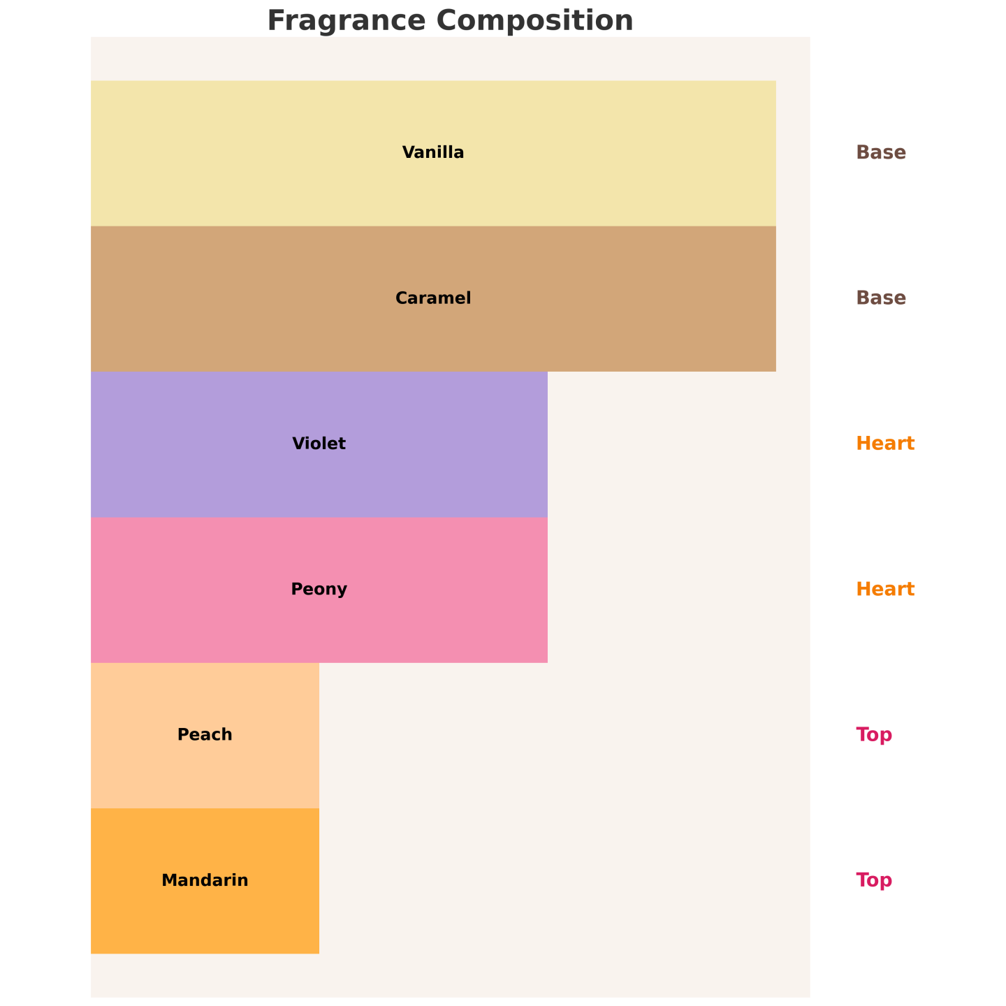 Fruity, floral and sensual: juicy peach and mandarin, romantic peony and violet, warm vanilla and caramel.