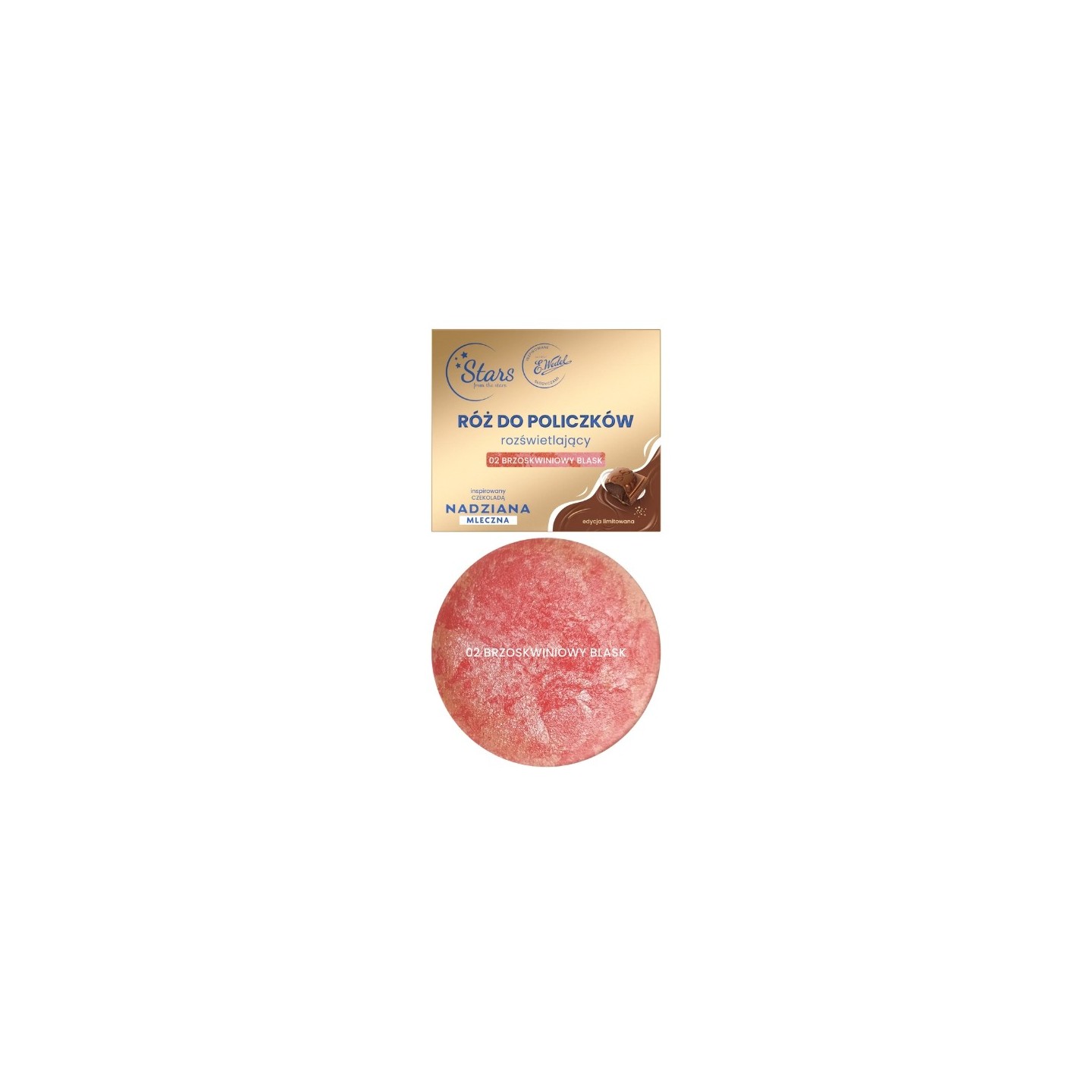 Illuminating Blush 02 Peach Shine is a unique cosmetic that combines the functionality of makeup with sensual experiences inspired by NADZIANA chocolate from E.Wedel. This marbled blush with an amazing chocolate scent gives the cheeks a healthy, peach blush and a subtle glow. The combination of two complementary shades allows for a perfect color match to the complexion, and the baked formula ensures excellent blending, intense shine and high efficiency.