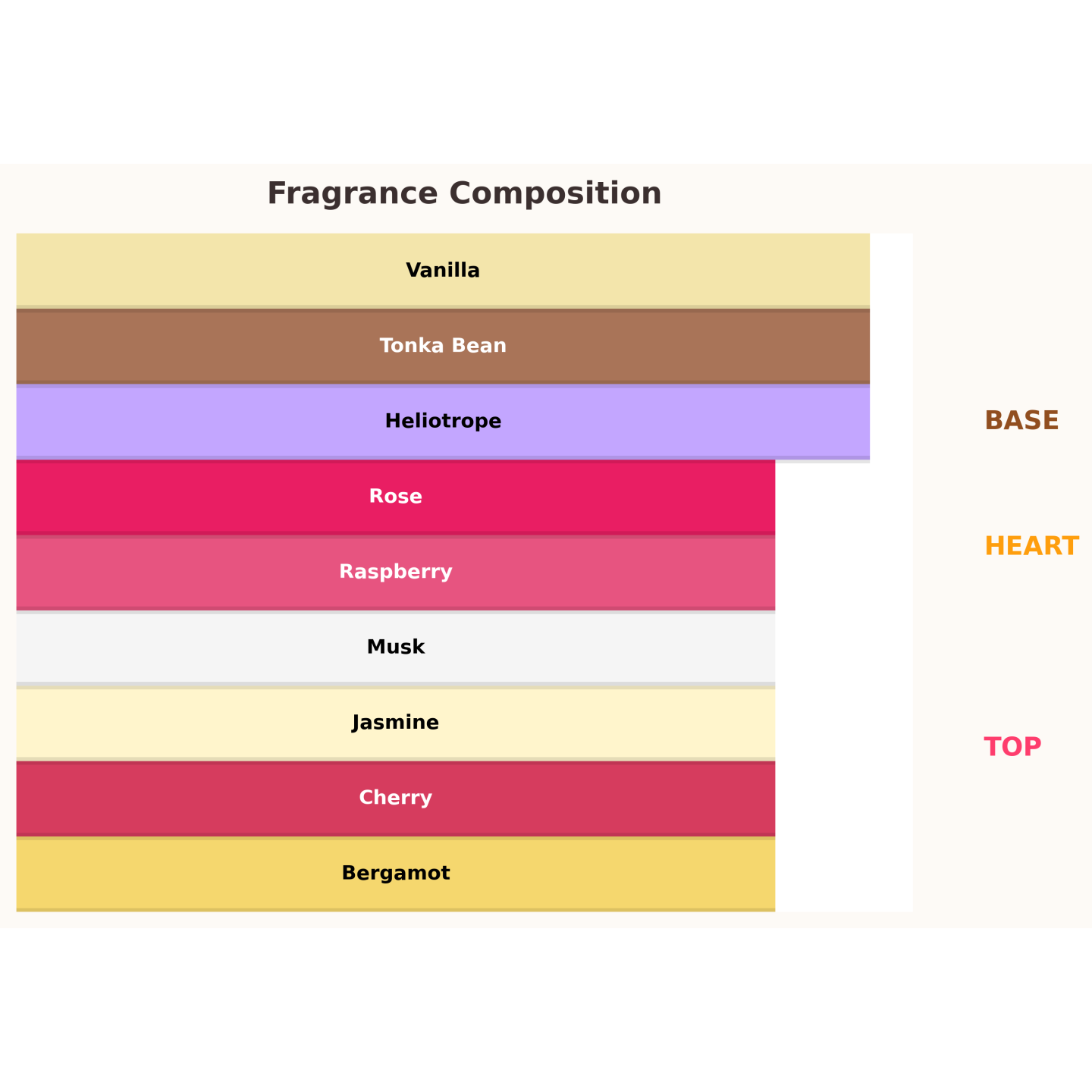 Już od pierwszych chwil Sweet Cherry Kiss otula skórę radosnym, letnim duetem wiśni i malin doprawionym świeżością bergamotki. W sercu rozkwita pudrowy akord heliotropu, róży i jaśminu, który dodaje kompozycji kobiecego wdzięku. Baza z fasolką tonką, wanilią i piżmem tworzy miękki, zmysłowy ogon zapachu. Idealny wybór na wiosnę i lato – lekki, świeży, przyciągający uwagę swoją owocowo-kwiatową harmonią.