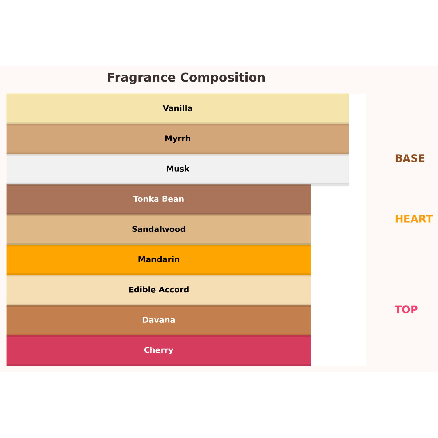 Sweet Heaven Cherry – słodko-owocowy zapach z orientalnym akcentem: wiśnia i mandarynka z davaną w otwarciu, aksamitne serce mirry i sandałowca, a w bazie piżmo, wanilia i tonka