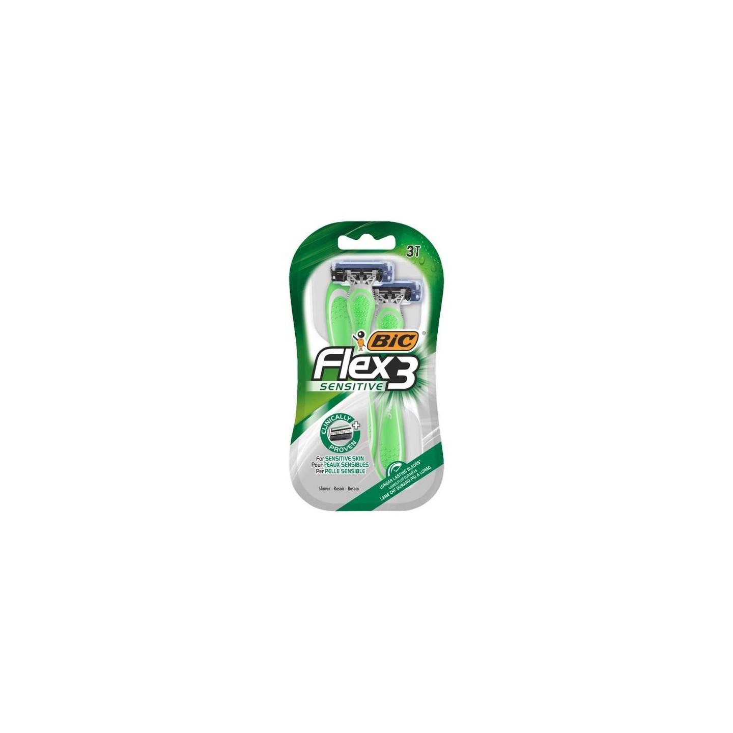 Бритва Flex 3 Sensitive — це бритва з рухомою головкою та 3 лезами Nano Tech, які рухаються незалежно один від одного, що робить полоскання надзвичайно легким. Леза індивідуально адаптуються до контурів обличчя, забезпечуючи ретельне гоління. Вони мінімізують подразнення та почервоніння. Голова має діапазон регулювання 30 градусів під форму обличчя. Зволожуюча смужка з натуральними інгредієнтами для кращого ковзання підходить для чутливої шкіри. Неоново-зелене вигнуте гумове лезо забезпечує кращий контроль під час гоління.