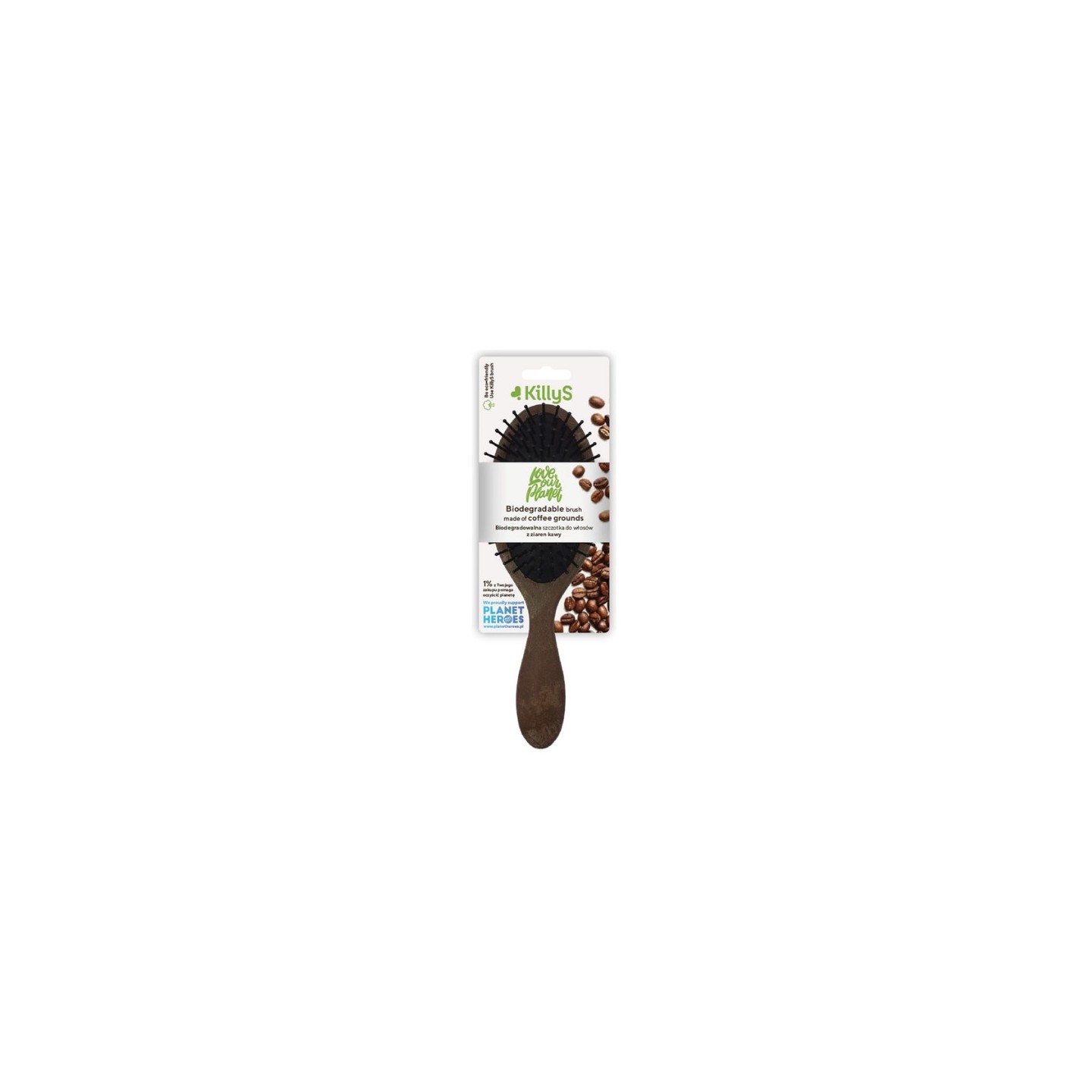 Гребінець, виготовлений на 70% з натуральної сировини, переважно кавових зерен, є екологічно чистим засобом для догляду за волоссям. Його біорозкладна ручка розкладається на 96% швидше, ніж стандартні пластикові пляшки, що робить його екологічно відповідальним вибором. Щітка має пневматичний корпус овальної форми з пластиковими шпильками, які не тільки ефективно розчісують волосся, ale і ніжно масажують шкіру голови під час використання. Це ідеальний засіб для поділу пасом волосся та забезпечення їм належного догляду. Профільована плоска ручка щітки полегшує маневрування під час укладання волосся, що дозволяє досягти бажаного ефекту. Упаковка, виготовлена з крафт-паперу, підлягає переробці, що додатково підтримує турботу про нашу планету. Ця гребінець - відмінний вибір для тих, хто хоче поєднати турботу про своє волосся з турботою про навколишнє середовище.