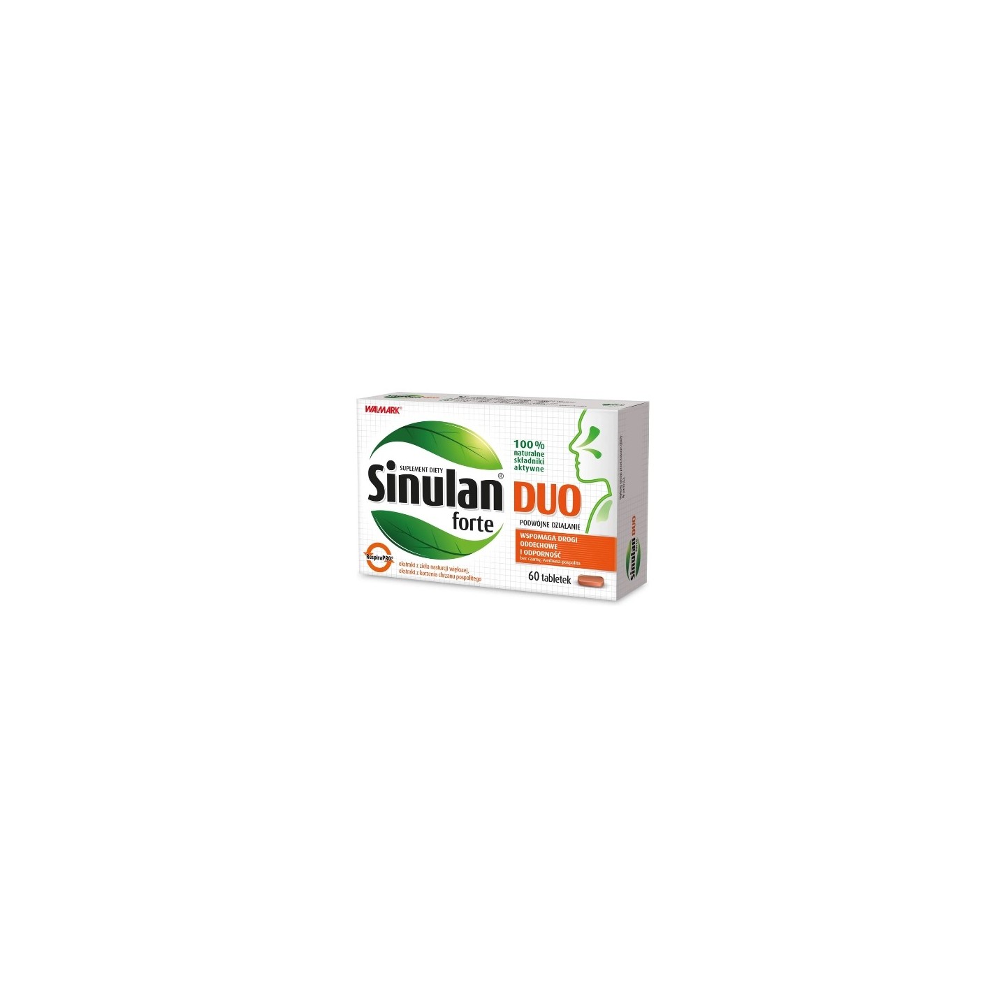 Sinulan Duo Forte - це харчова добавка у формі таблеток, розроблена для підтримки імунної системи та здоров'я дихальних шляхів, включаючи пазухи носа. Формула si на натуральних рослинних екстрактах, які підтримують функціонування організму, особливо в період ослаблення імунітету та підвищеного ризику зараження. Добавка містить запатентований комплекс Respira PRO – поєднання екстракту трави настурції та кореня хрону. Ці інгредієнти підтримують дихальні шляхи, сприяючи їх природному очищенню та покращуючи комфорт дихання. Крім того, рослинні екстракти благотворно впливають на роботу імунної системи.