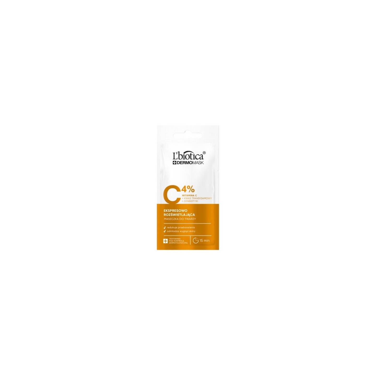 Експресивно освітлююча маска - це концентрована вітамінна ампула для шкіри з плямами, сірим і нерівним тоном. dermo -формула, багата активними інгредієнтами, швидко та ефективно усуває плями та зміни кольору, освітлюючи шкіру та повертаючи їй сяючий вигляд. Дія діючих речовин: