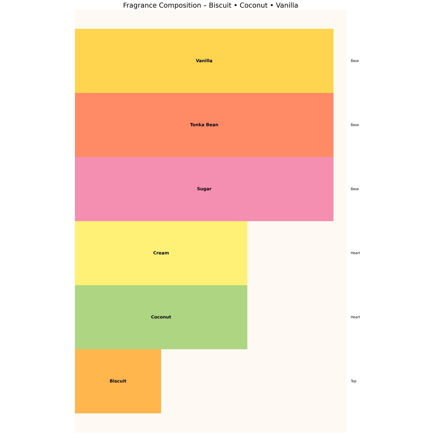 Creamy Biscuit – це аромат, який буквально балує почуття. Це справжня гурманська насолода – теплий, солодкий і неймовірно приємний. Створений для тих, хто любить аромати, що нагадують їхні улюблені десерти, сповнені вершкової солодкості та затишного характеру. Композиція si ароматом свіжоспеченого бісквіта – маслянистим, м’яким і ніжно-солодким. Цей акорд одразу викликає асоціації з теплом і затишком дому. Серце – це оксамитове поєднання кокоса та вершків, що надає аромату вершкової глибини та десертного характеру. Цей етап неймовірно обволікає та викликає звикання. База – це справжня солодка насолода: ваніль, цукор і боби тонка створюють теплий, бальзамічний і тривалий акорд, який затримується на шкірі, як ніжна, солодка вуаль. Creamy Biscuit – це аромат для тих, хто хоче пахнути своїм улюбленим десертом – м’яким, солодким і неймовірно приємним.