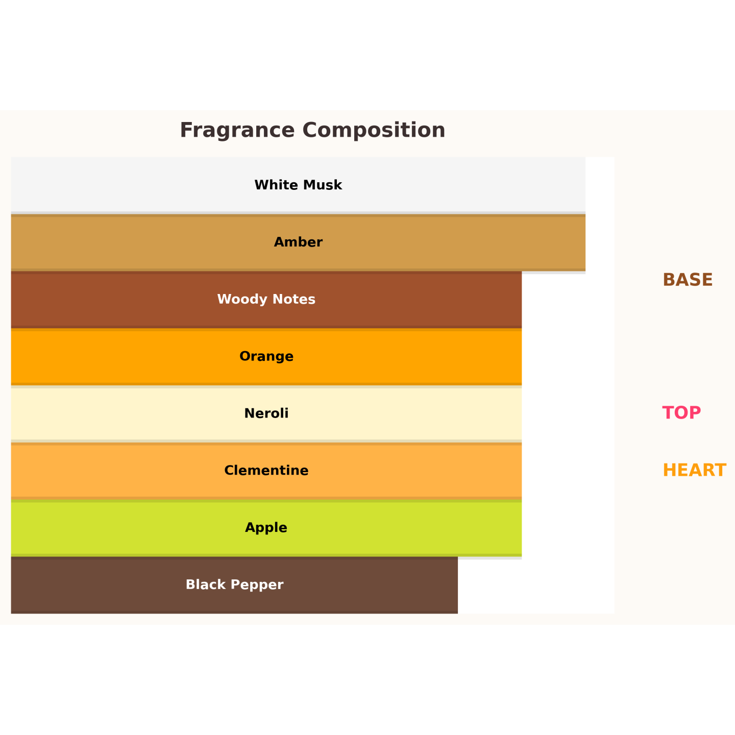 Indomitable втілює енергію сонячного дня. Іскристий клементин та апельсин забезпечують освіжаючий старт, після чого композиція набуває характеру завдяки поєднанню хрусткого яблука, перцевої нотки та благородних деревних акордів. База з білого мускусу, сяючого неролі та теплого бурштину огортає шкіру тривалою, чуттєвою аурою. Ідеально підходить для тих, хто любить підкреслити свою індивідуальність свіжим, але самобутнім тоном.