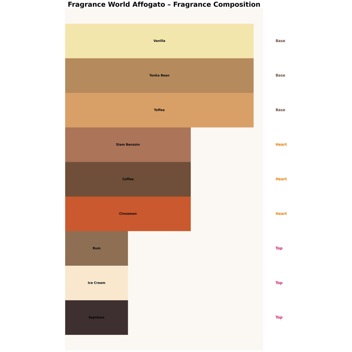 Affogato – це данина італійському мистецтву святкування смаку та аромату. Цей аромат створений для поціновувачів елегантності, гурманських тонів та глибокої чуттєвості. Як і культовий десерт – гарячий espresso литий поверх холодного морозива – тут також контрасти створюють гармонію, а розкішний характер композиції огортає вас, немов м’яка, ароматична вуаль. Початок парфумів – це миттєва насолода: ром, вершкове морозиво та насичений еспресо створюють насичений, глибокий та неймовірно апетитний акорд. У серці домінує кава, оповита пряною корицею та смолистим, злегка екзотичним сіамським бензоїном, si аромат теплішим, обволікаючим та чуттєвим. База – це справжні гурманські ласощі: toffee , солодка ваніль та оксамитові боби тонка залишають на шкірі тривалий, кремовий, ароматний шлейф. Цей аромат ідеально підходить для прохолодних днів, вечорів, побачень, відпочинку та моментів, коли ви хочете загорнутися в щось приємне та надзвичайно елегантне. Унісекс – хоча особливо сподобається любителям солодких кавових композицій.