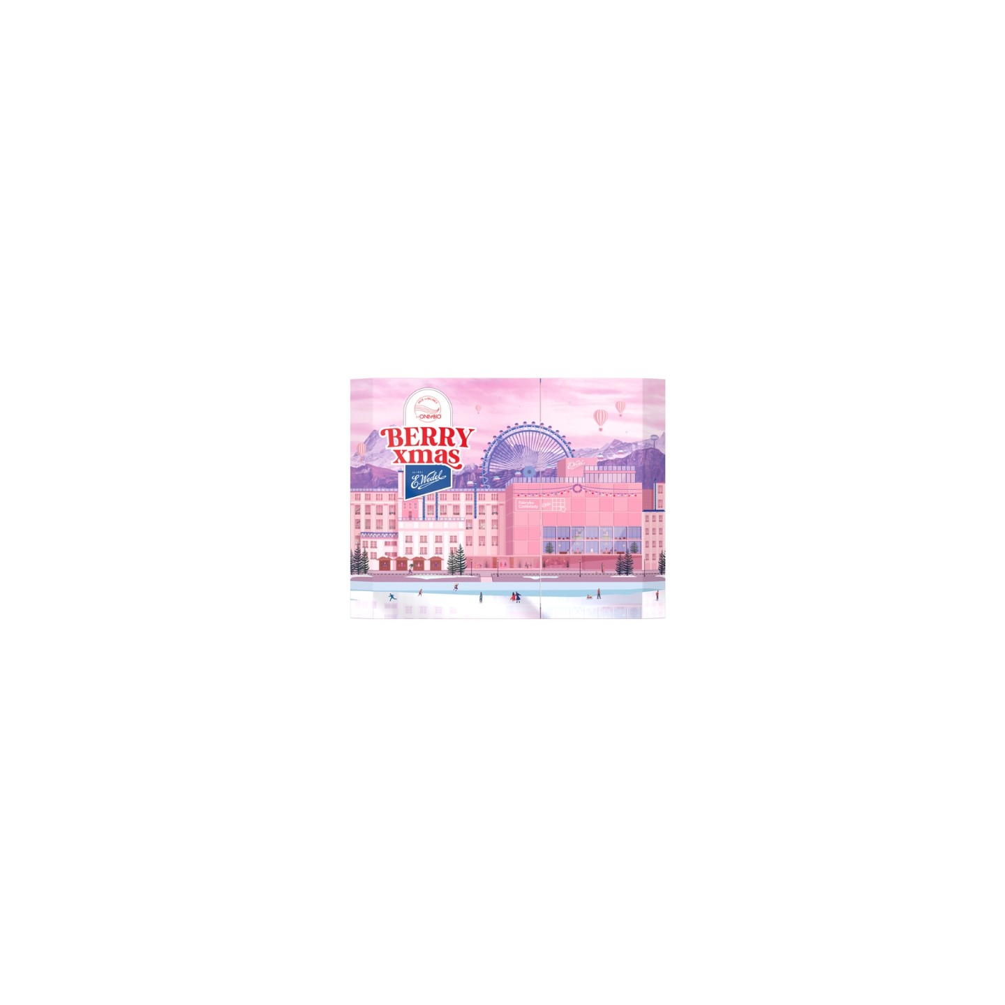 Молочний шоколад з ягідною начинкою (50%) - Молочний шоколад 50% (Цукор, Какао-масло, Сухе незбиране молоко, Какао-терте, Суха молочна сироватка (з молока), Молочний жир, Емульгатори: лецитини (з сої), E476, Ароматизатор), Цукор, Рослинний жир (пальмовий), Сухе молоко, Суха молочна сироватка (з молока), Глюкозно-фруктозний сироп, Сироватковий білок (з молока), Йогуртовий порошок, Вода, Сублімовані ягоди 0,5%, Глюкозний сироп, Лактоза (з молока), Цукор, Модифікований крохмаль, Концентрат соку чорної моркви, Ароматизатор. Може містити арахіс, інші горіхи, яйця, злаки, що містять глютен. Вміст какао-продуктів у молочному шоколаді не менше 25%.
