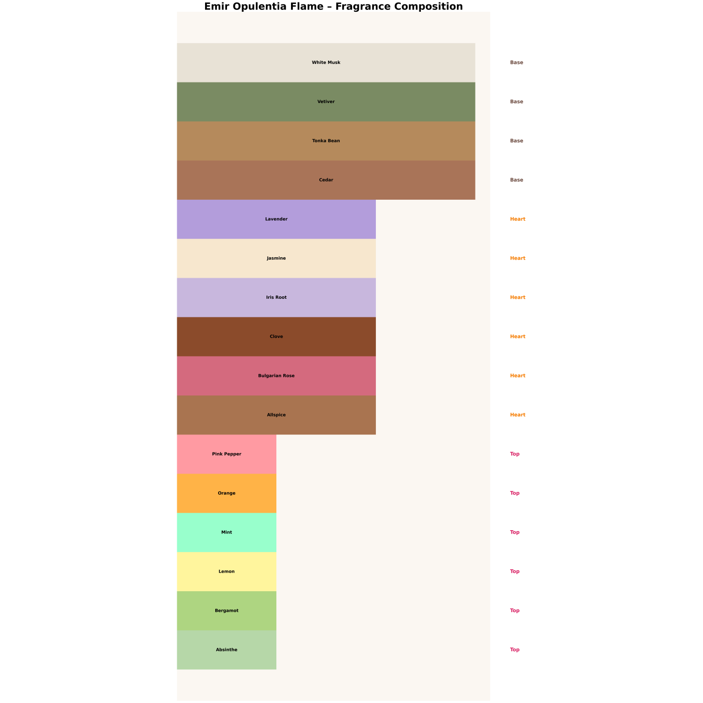 Opulentia Flame – це композиція для тих, хто прагне si з натовпу та свідомо будувати свою присутність за допомогою аромату. Цей парфум має інтенсивну, вогняну душу – сповнену енергії, сміливості та магнетичного шарму. Виразний характер початкових нот, багатство спецій у серці та елегантна деревно-мускусна база створюють гармонійне, але безкомпромісне ціле. Початкові ноти починаються з сильного акценту рожевого перцю, свіжої м'яти, бергамоту, лимона, сухого абсенту та соковитого апельсина – вибухової суміші свіжості та пряної іскри. Серце аромату пульсує ароматичним та квітковим багатством: лаванда, болгарська троянда, гвоздика, запашний перець, жасмин та пудровий корінь ірису, створюючи елегантний, інтенсивний та багатовимірний середній шар. База побудована на землистому ветивері, благородному кедрі, м'якому білому мускусі та вершкових бобах тонка, що надає композиції тепла, довговічності та чуттєвого післясмаку. Це аромат для тих, хто хоче відчути внутрішній вогонь – рішучість, спонтанність та готовність до дії. Ідеально підходить для тих, хто хоче залишити незабутнє враження на кожній події.