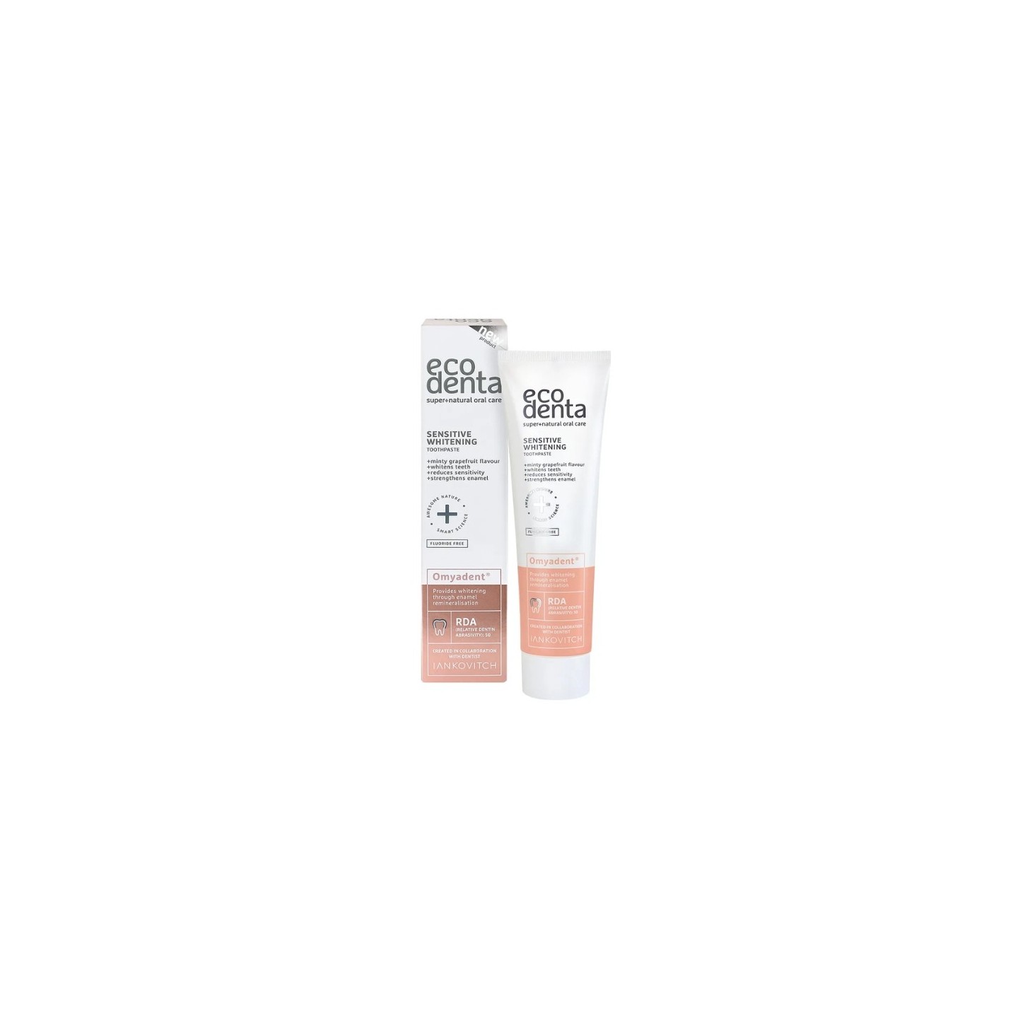 Засіб для щоденної гігієни порожнини рота, спеціально розроблений для людей з чутливими зубами. Формула пасти містить інноваційний інгредієнт Оміядент, який ефективно знімає підвищену чутливість зубів, зміцнює емаль і захищає від карієсу. Оміядент – біоактивна речовина, яка сприяє ремінералізації емалі, відновлює її структуру та забезпечує тривалий захист. Зубна паста Ecodenta Sensitive не тільки знімає біль, пов’язану з підвищеною чутливістю, ale й запобігає її рецидивам, забезпечуючи щоденний комфорт. Завдяки делікатній формулі паста безпечна для емалі та ясен і не викликає роздратування.