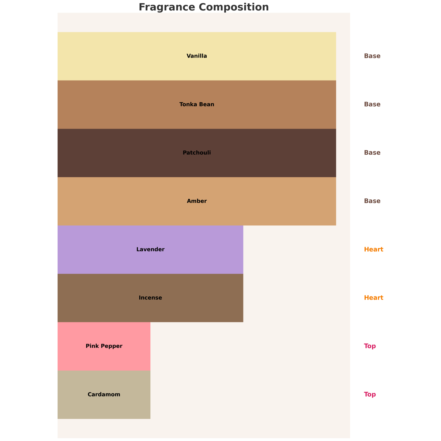 Orientalnie i korzennie — pikantny kardamon i różowy pieprz, aromatyczna lawenda, kadzidło oraz słodko-balsamiczna baza wanilii, tonki i bursztynu.