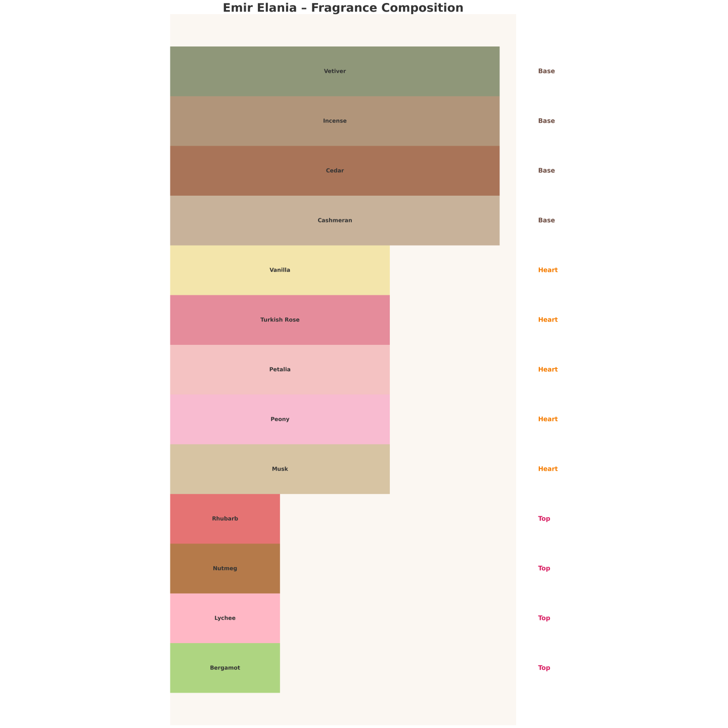 Świeżo i owocowo w otwarciu (liczi, rabarbar), kwiatowo i kremowo w sercu (róża, piwonia, wanilia), elegancko i drzewnie w bazie (cashmeran, cedr, wetyweria, kadzidło).