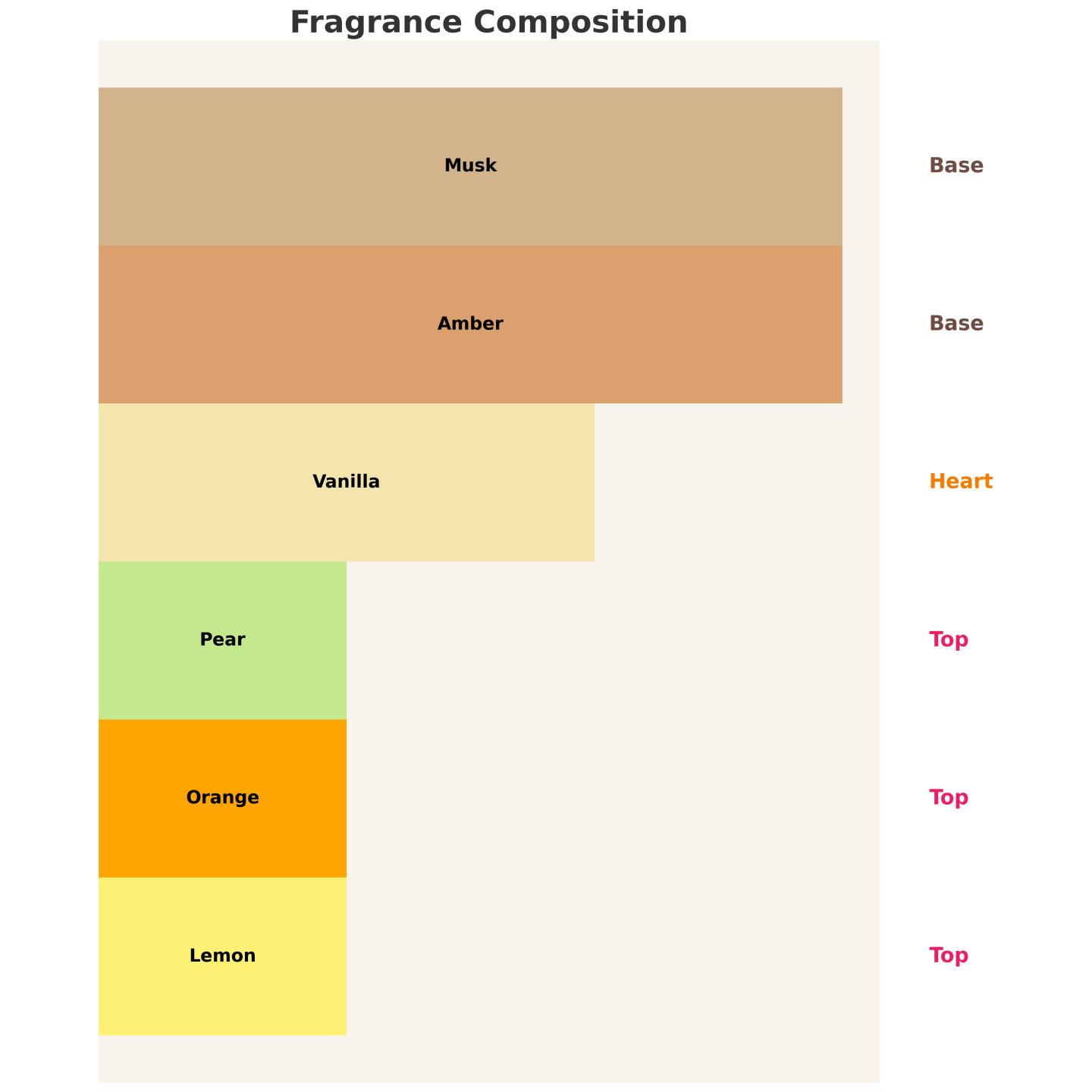 Świeżo, radośnie i energetycznie: cytrusy i owoce w otwarciu, wanilia w sercu, piżmo i bursztyn w bazie.